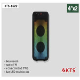اسپیکر بلوتوثی قابل حمل مدل KTS-1622 یک محصول با ابعاد 15x42x18 سانتی متر و وزن 1715 گرم می باشد که باتوجه به کیفیت مناسبی که دارد از قیمت معقولی برخوردار است.این اسپیکر دستی و قابل حمل دارای 2 باند 4 اینچی می باشد که صدای خروجی بسیار خوبی دارد. بدنه این محصول از جنس پلاستیک می باشد که در نمای روبرویی یک صفحه کلید شامل دکمه های توقف، پخش، قبلی و بعدی و … با دسترسی بهتر برای کنترل آسان در نظر گرفته شده است. همچنین یک فرورفتگی برای قرارگیری دست در آن تعبیه شده است. از مزیت های این دستگاه وجود نورپردازی RGB می باشد که با LED های خوش رنگ و با کیفیت، نوردهی زیبایی را انجام می دهد و می توان در مواقع دلخواه آن ها را تنظیم کرده و خاموش و روشن نمود. اسپیکر بلوتوثی قابل حمل مدل KTS-1622 دارای یک باطری لیتیومی از نوع شارژی با ظرفیت 1500 میلی آمپر می باشد که برای استفاده در طبیعت و خارج از منزل کاربردی است. این باطری توسط کابل شارژ microUSB شارژ می گردد که در بسته بندی محصول قرار گرفته است.این بلندگو با پشتیبانی از بلوتوث قابلیت سازگاری با تمام دستگاه ها مانند تلفن همراه، تبلت و… با سیستم عامل های IOS و اندروید را دارد. همچنین امکان پخش از طریق فلش و کارت حافظه و درگاه میکروفن در آن فراهم می باشد.